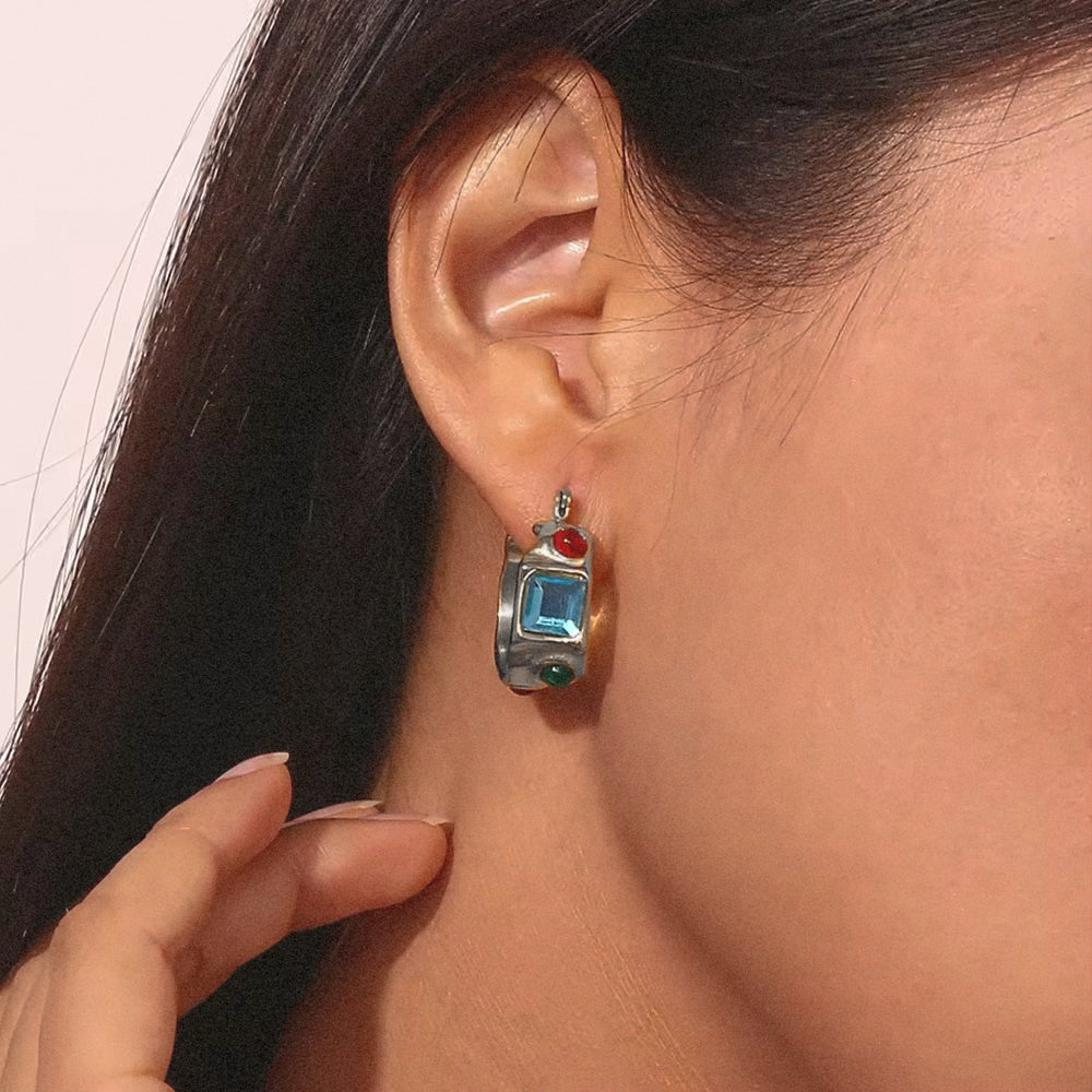 Introducing our Caldaro hoops in stunning silver, adorned with vibrant red, blue, and green stones. These exquisite earrings add a pop of color to any outfit, making them a versatile and eye-catching addition to your jewelry collection.