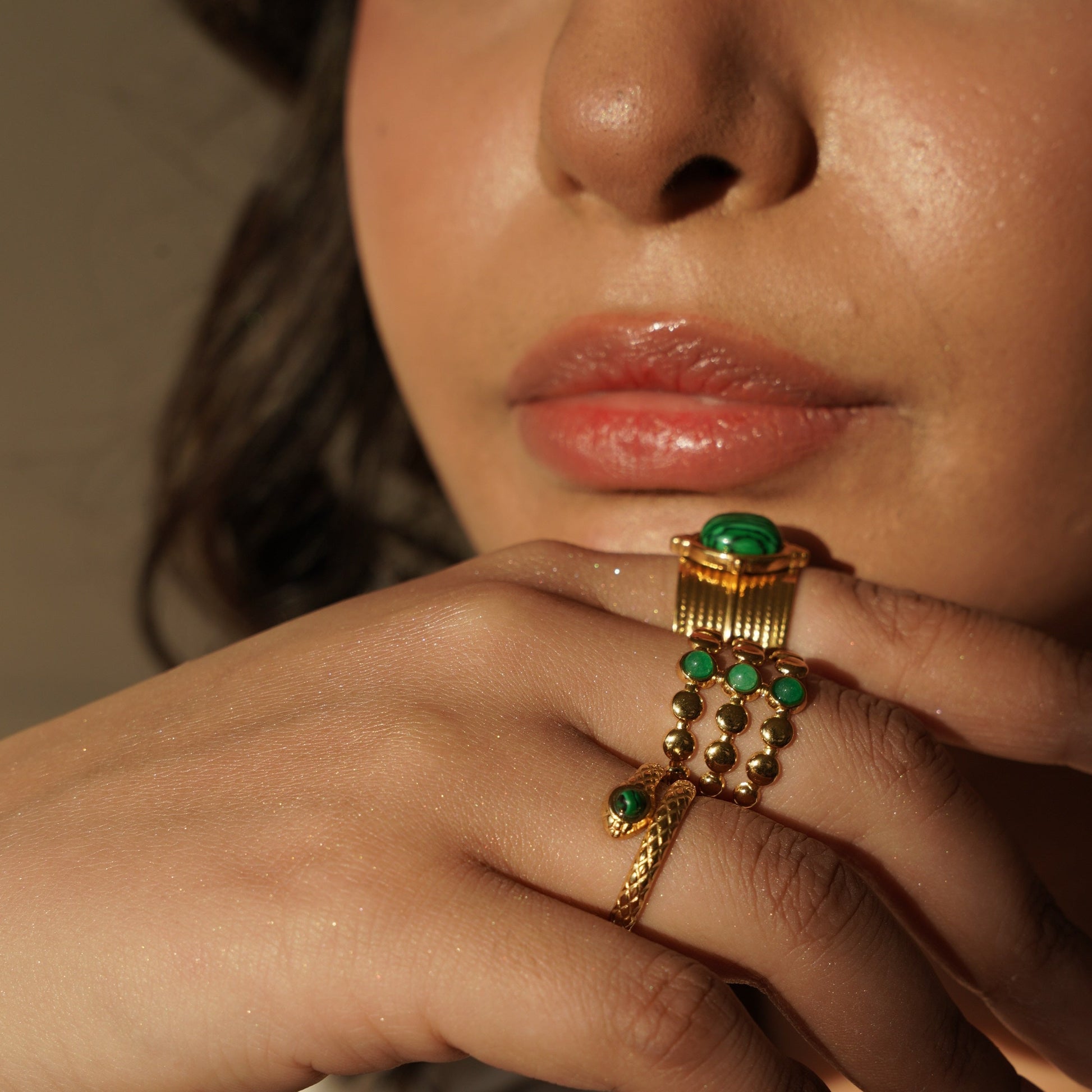 Set with a stone of deep dark hue, our Comiso ring combines gold and green for a match made in heaven. Style this signature piece solo, or stack with more delicate styles.