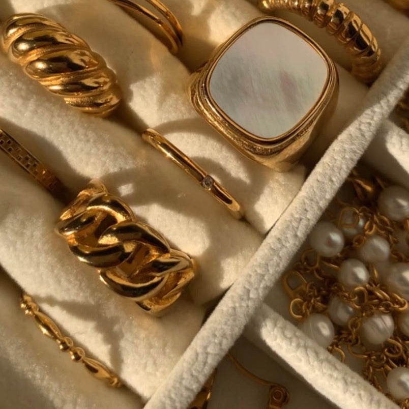 Stainless steel is an alloy of steel and chromium. It combines strength, durability, and functionality of steel. I mean it, Google it, it lasts a lifetime. It should be cleaned carefully with a soft non-abrasive cloth to maintain shine.  Above all, make sure to dry your jewelry carefully and gently. The golden plating will experience discolouring over time due to factors such as exposure to moisture, chemical and air may turn slightly darker after wearing. Try to prevent plated rings from knocking into counter tops or rubbing against car keys buried in pockets and purses.