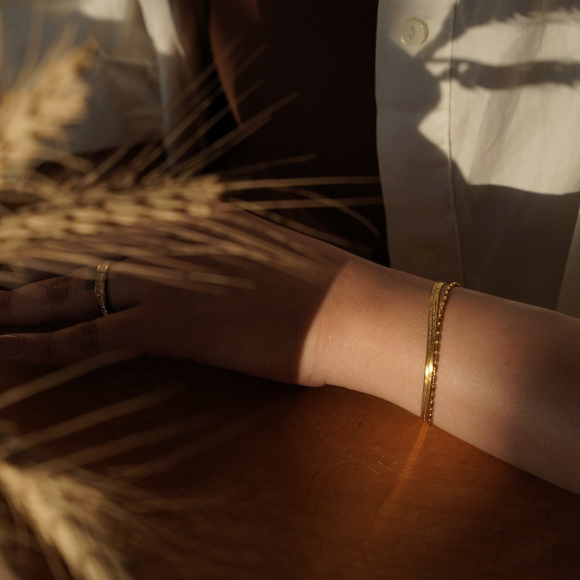 How to fulfill your wrist stacking dreams, you ask? Prato is your answer. Our bestselling Santos bracelet got an upgrade. Two bracelets in one, snake chain combined with a dainty chain so you don’t have to worry about layering it with other bracelets. Wear it alone and let it be the main attraction.
