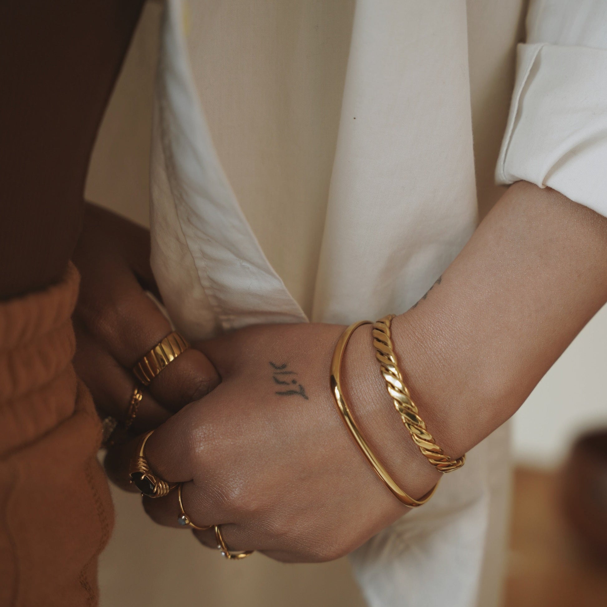 Stainless steel is an alloy of steel and chromium. It combines strength, durability, and functionality of steel. I mean it, Google it, it lasts a lifetime. It should be cleaned carefully with a soft non-abrasive cloth to maintain shine.  Above all, make sure to dry your jewelry carefully and gently. The golden plating will experience discolouring over time due to factors such as exposure to moisture, chemical and air may turn slightly darker after wearing. Try to prevent plated rings from knocking into counter tops or rubbing against car keys buried in pockets and purses.