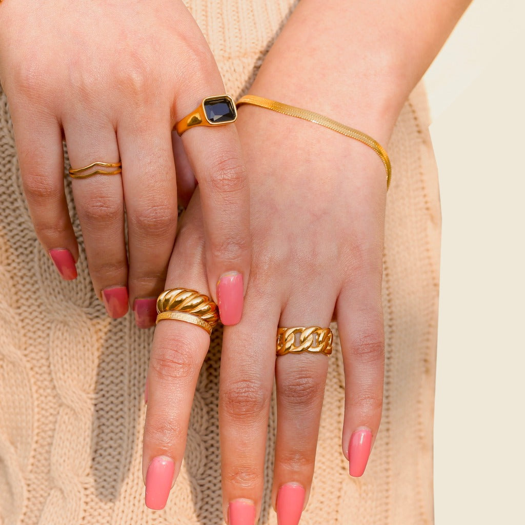 Stainless steel is an alloy of steel and chromium. It combines strength, durability, and functionality of steel. I mean it, Google it, it lasts a lifetime. It should be cleaned carefully with a soft non-abrasive cloth to maintain shine.  Above all, make sure to dry your jewelry carefully and gently. The golden plating will experience discolouring over time due to factors such as exposure to moisture, chemical and air may turn slightly darker after wearing. Try to prevent plated rings from knocking into counter tops or rubbing against car keys buried in pockets and purses.