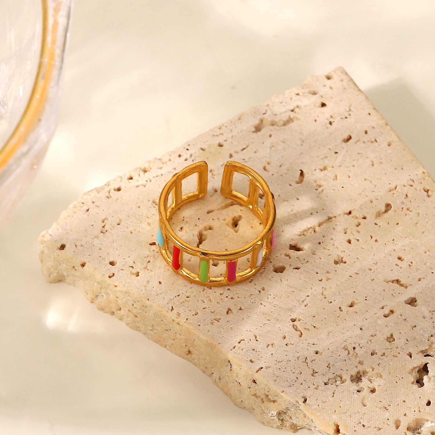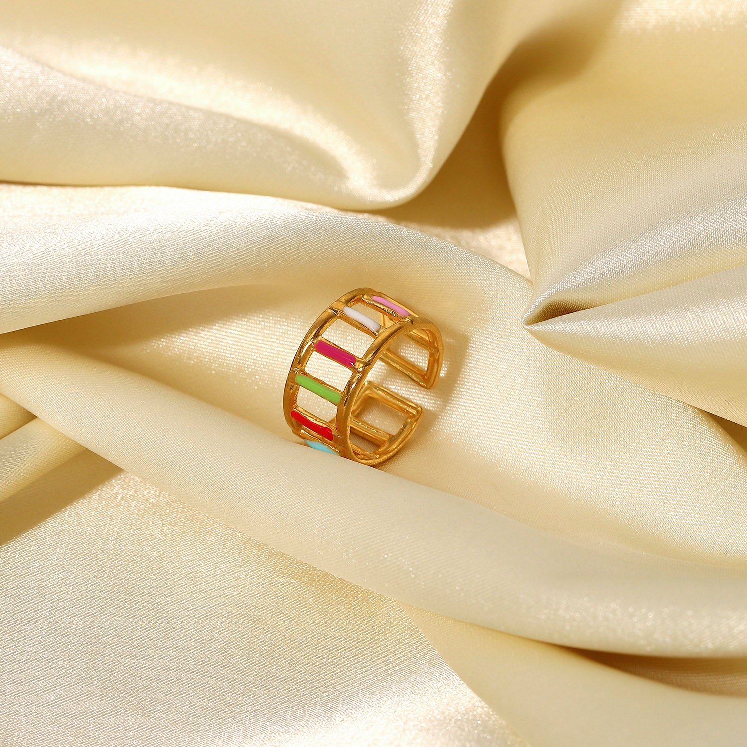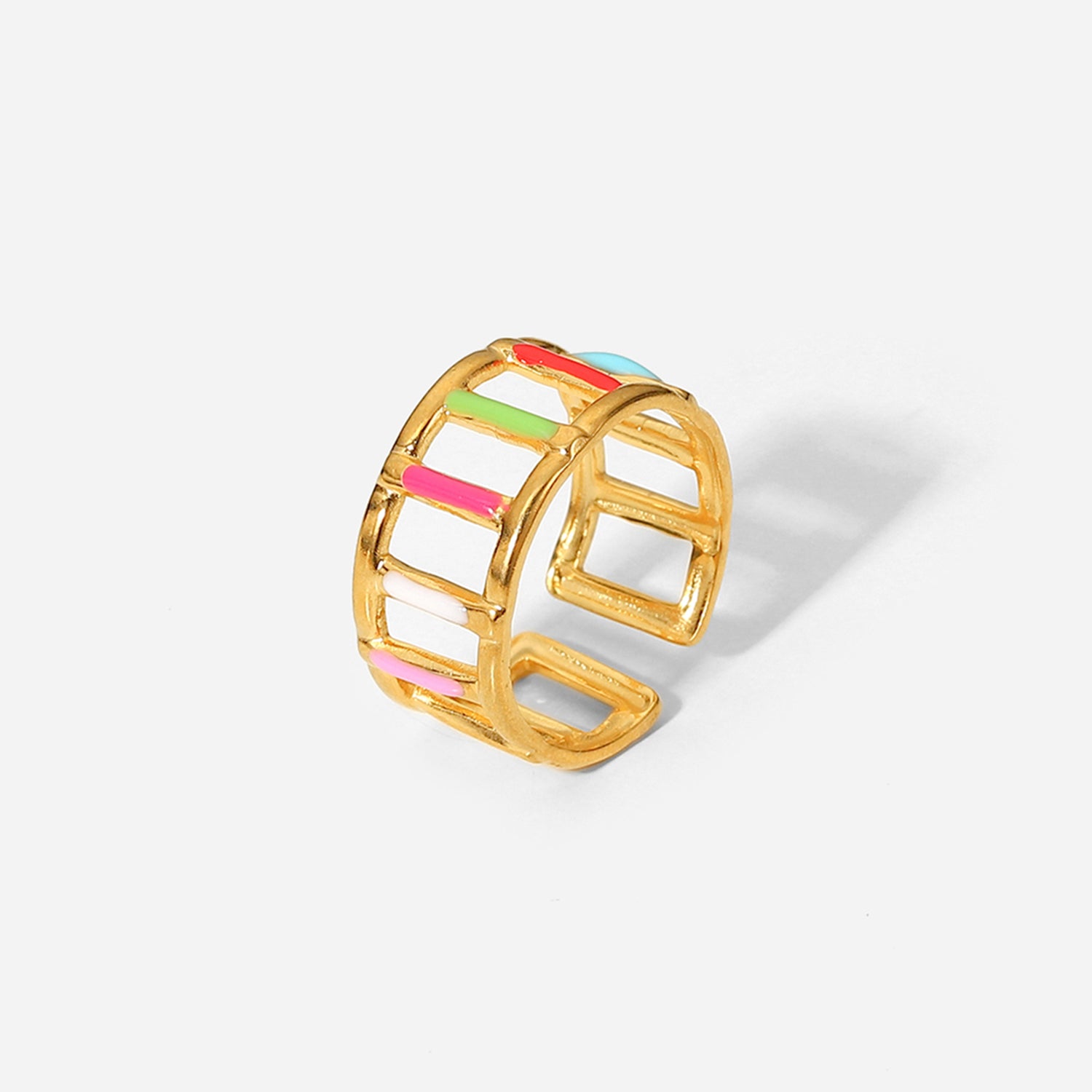 Upgrade your ring stack with a bright coloured palette. Syros warm colour palette reminiscent of summer is the perfect way of adding a touch of playfulness to your outfit. Enjoy plenty of compliments with your new favourite ring! Our Syros Ring is made from stainless steel and 18k gold plating which only means the colour will last for a really long time so you can wear your jewellery every day, everywhere.